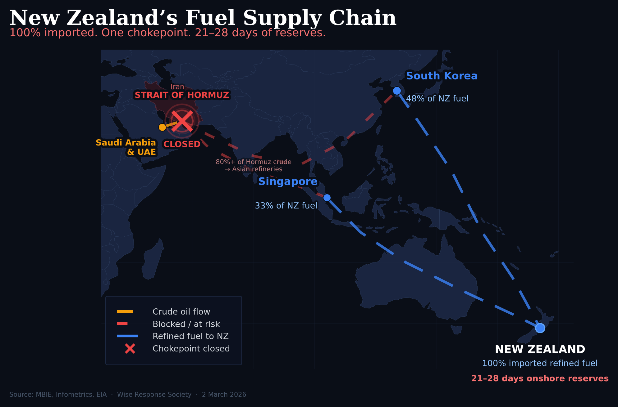 3 March 2026 - The Wise Response Society is warning that the military conflict now disrupting the Strait of Hormuz poses a direct and immediate threat to New Zealand’s fuel supply, and is calling on the government to be transparent with the public about the severity of our exposure and to take concrete steps to prepare for what may be a prolonged disruption.